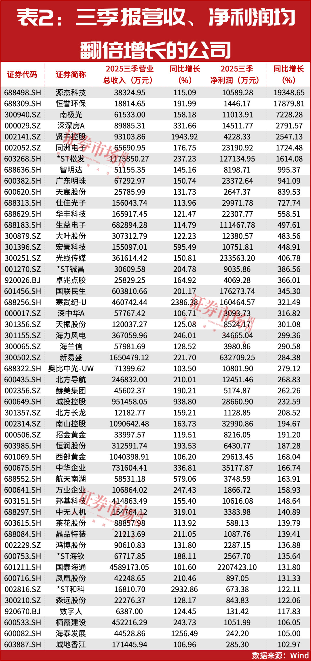 数据显示,今年前三季度,A股上市企业营收、净利润双双改善,一方面受益于“反内卷”及出口韧性所带来的量价改善,另一方面也与低基数效应有关。且业内人士认为,中美双方经贸磋商取得积极成果,国内新一轮稳增长政策有望逐步落地,上市公司盈利改善的趋势将进一步确立。个股中,51家公司营收、净利润均实现了同比翻倍增长,结合去年年报数据统计,超600家公司今年前三个季度的盈利额已经相较去年全年翻倍增长。