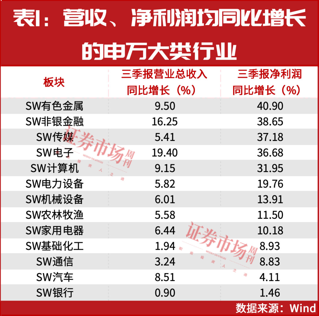 分板块统计,大类行业中,非银金融、电子的成长性相对最稳,营业总收入和归母净利润均实现了两位数的同比增长(见表1)。