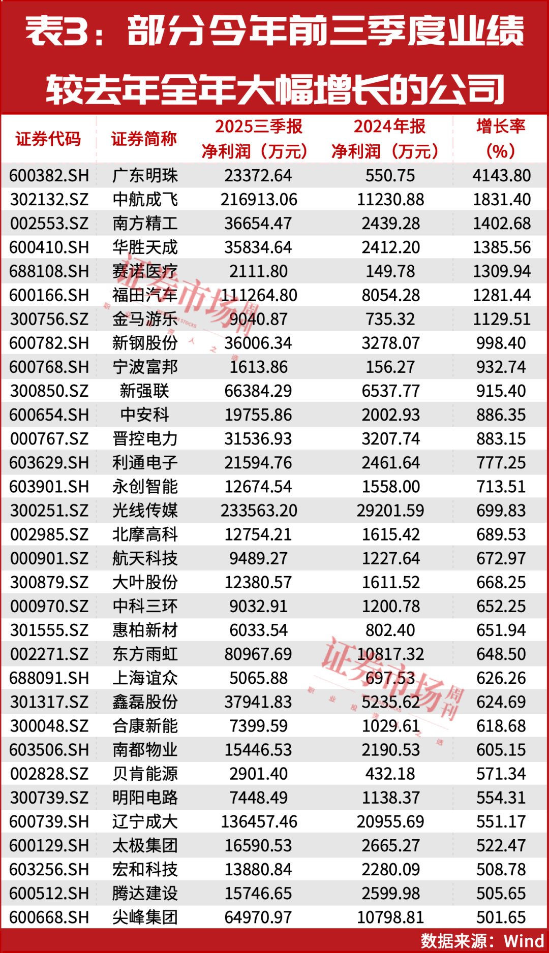 结合三季报与去年年报统计,虽然还有一个季度的利润尚未计入,但已有1540家公司今年前三季度的盈利额超过了去年全年,668家公司今年前三季度的净利润较去年全年有超100%的增长,四季度若不出现大额亏损,全年业绩高增长基本已被提前锁定。